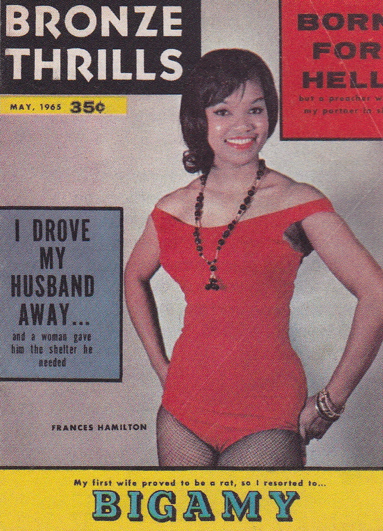 “If you are ever in the New York area and wish to obtain a book, be sure to call on librarian Frances Hamilton at the local library. The beautiful miss graces the May 1965 cover of Bronze Thrills. She stands 5 ft. 5 in. tall and weighs only 120. She has curves that are all in the right places (35-24-37) and has countless hobies. All sports and everthing else that anyone enjoys, she enjoys. That way, you know she in not hard to please. Don’t forget you will be looking for books!”